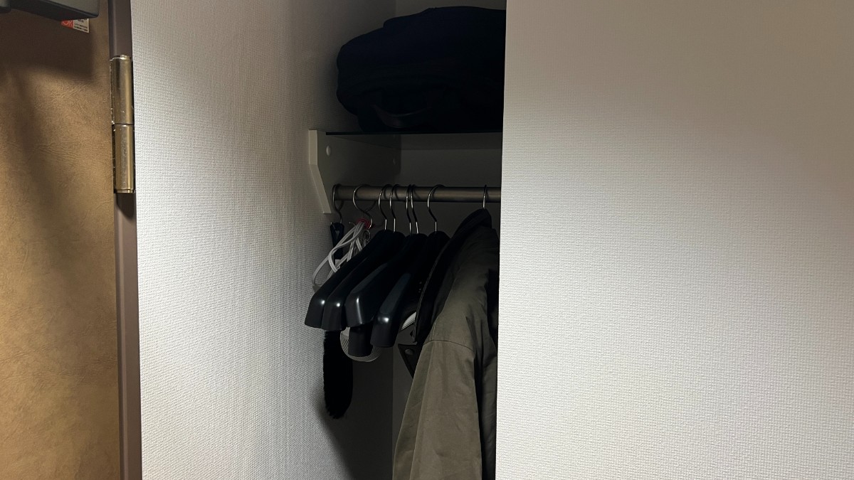 まず扉横のオープンクローゼット。幅は約35cmです。ハンガー多めなのが嬉しいですね。