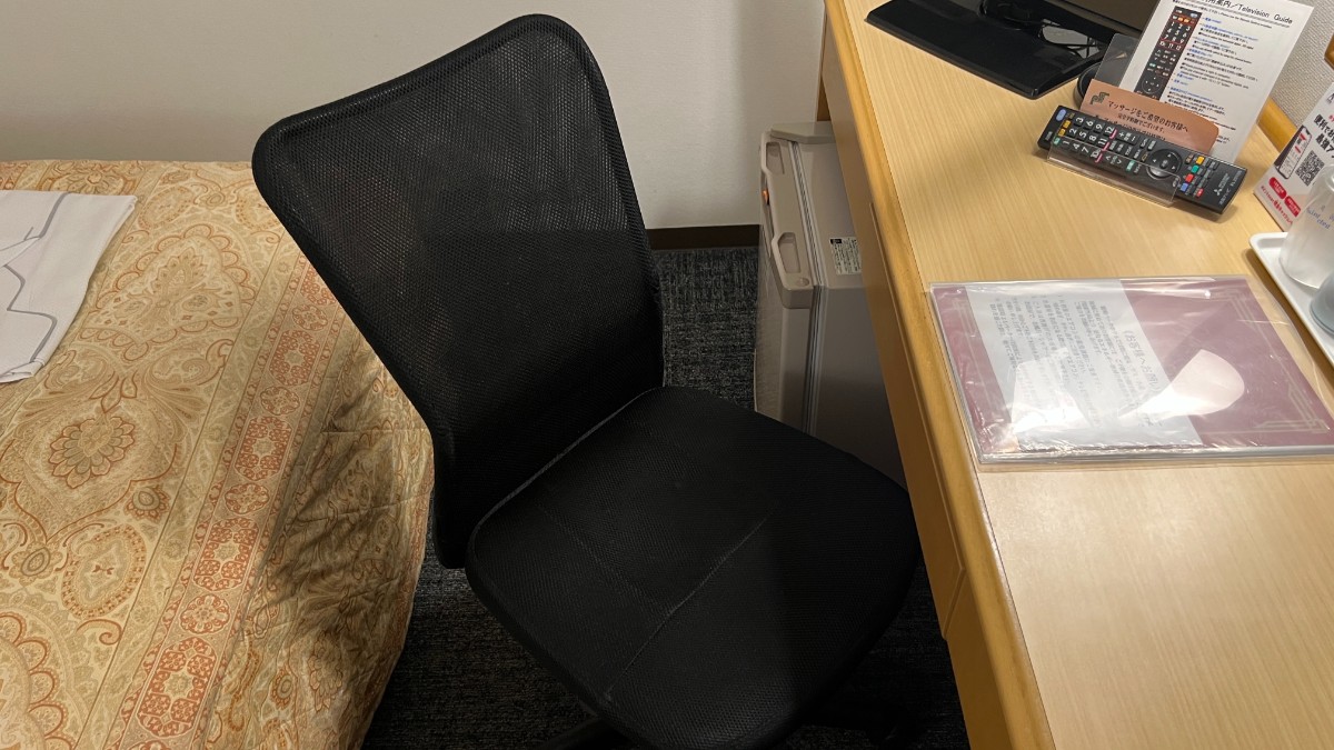 高さ調整もでき、いわゆる一般的なオフィスチェアですが、こういう椅子ってビジネスホテルにはあったりなかったりなんですよね。