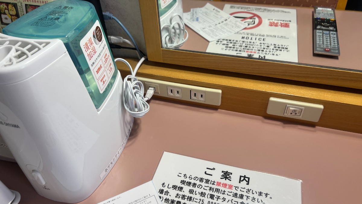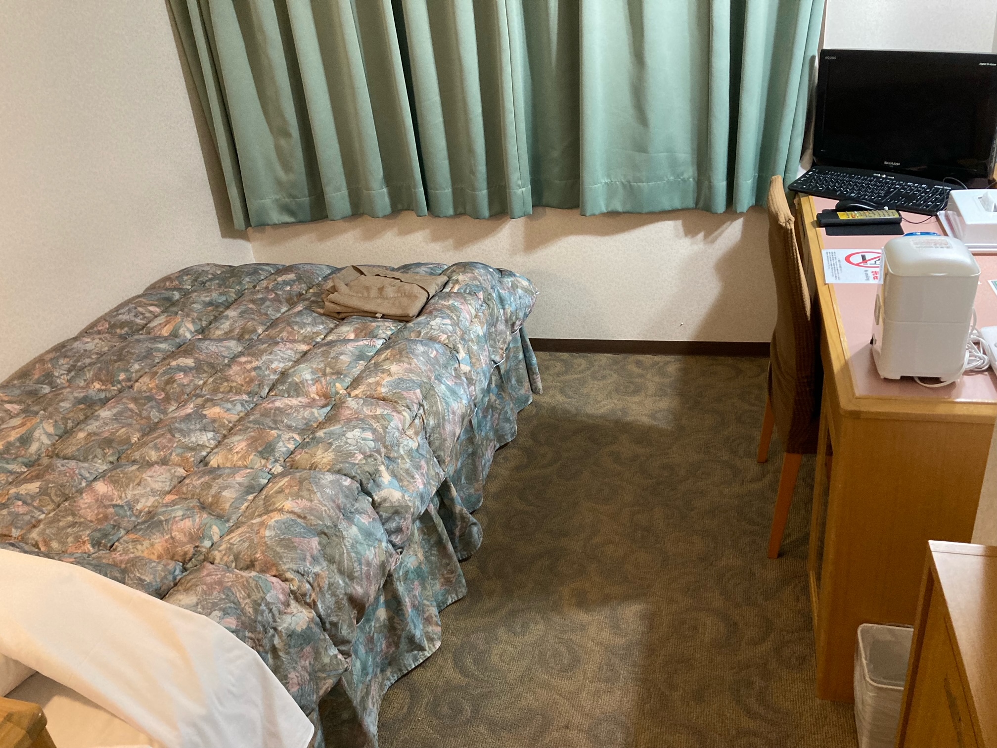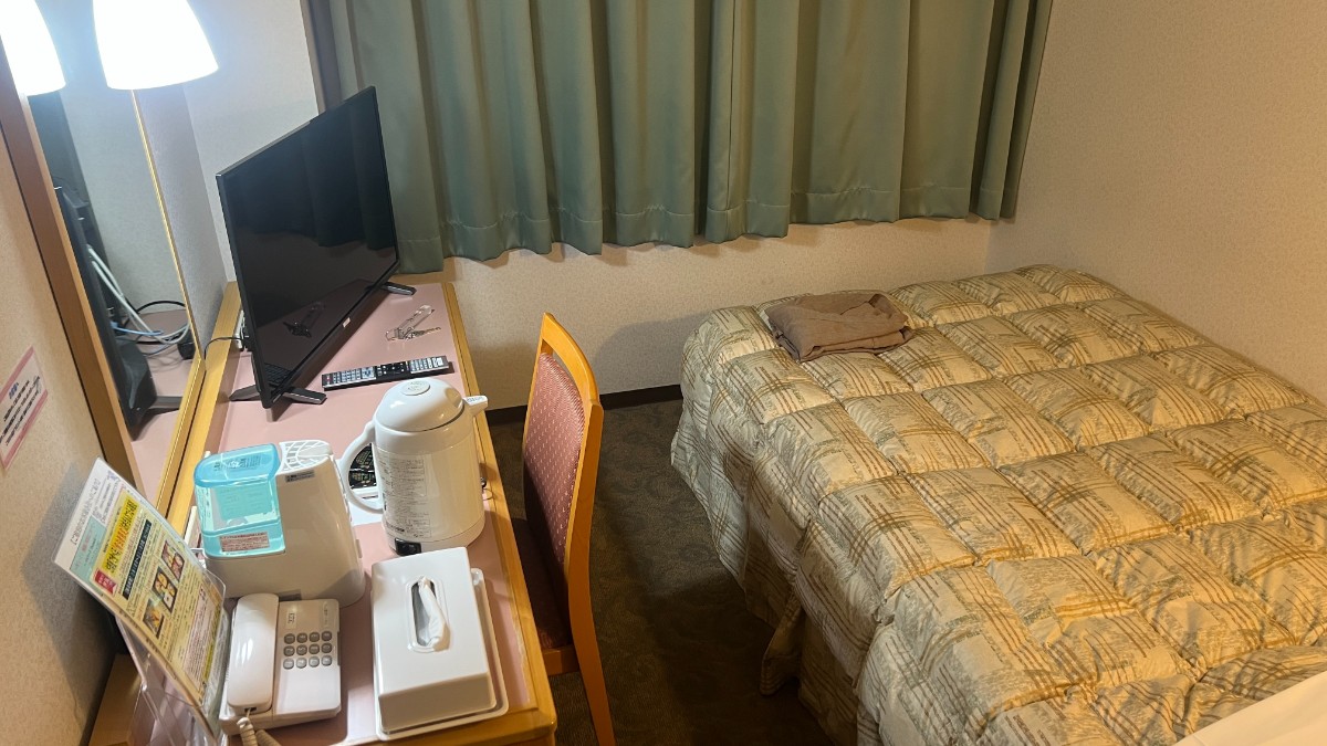 - 机はテレビにスペースが取られているが作業スペースは十分。ベッドにはコンセントがないため、スマホをベットで充電したい場合は延長コード持参が吉。