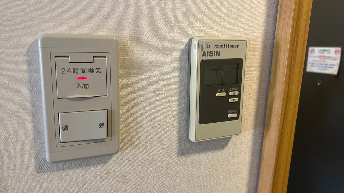 空調は個別空調です。入り口横のリモコンで操作をします。