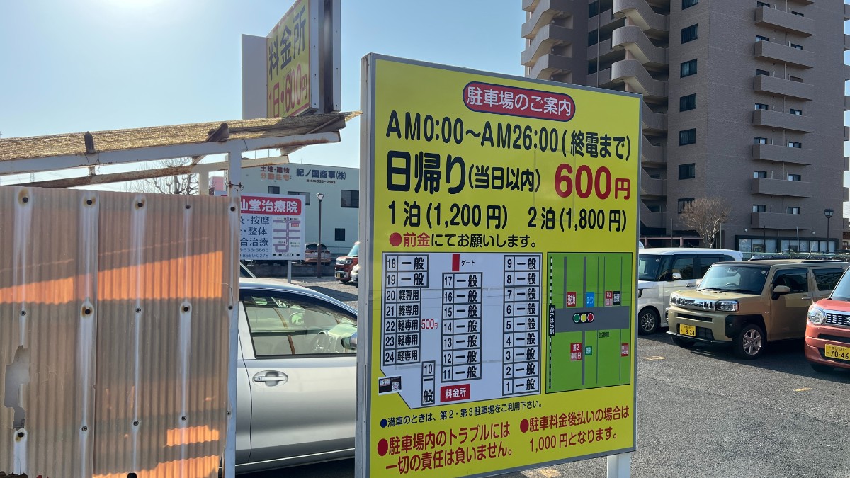 | 駐車場 | 屋外のため高さ制限なし 宿泊者は無料 周辺駐車場は400〜700円が相場 |