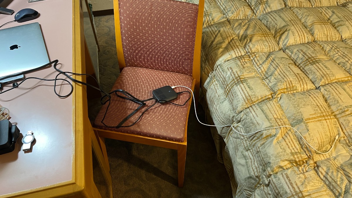 夜はこんな感じに椅子の座面においてスマホ充電をするという運用をしました。
