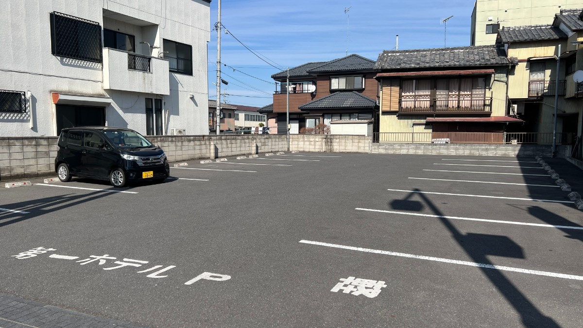 駐車場はホテル前と道路挟んだ向かいにあります。