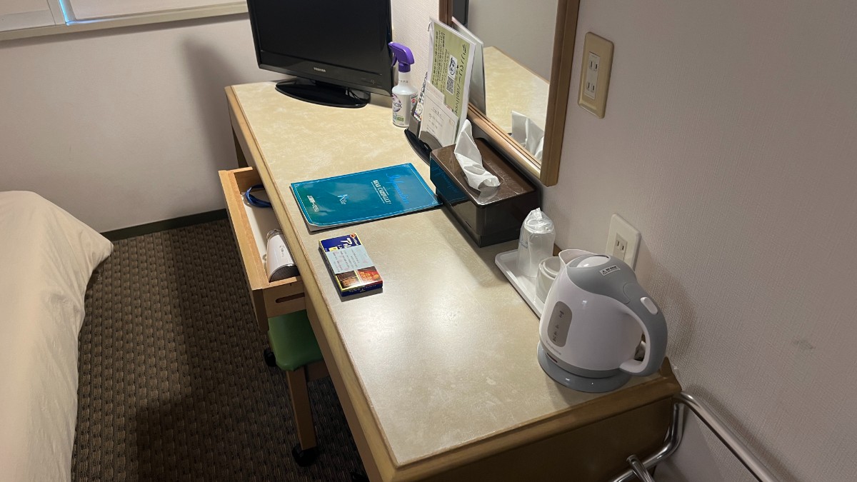 - 机は十分スペースがあり作業しやすい。コンセントも机側にあるので充電しやすい。ベッドにはコンセントがない。ベットで充電したい場合は延長コード持参が吉。