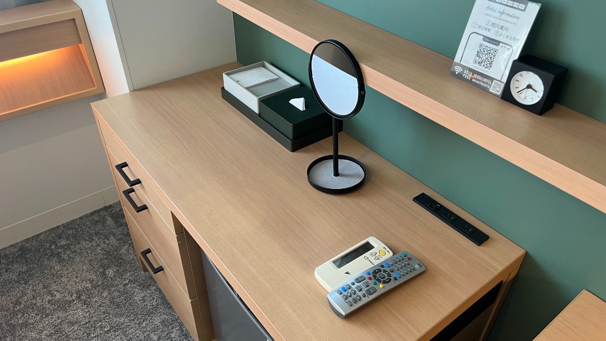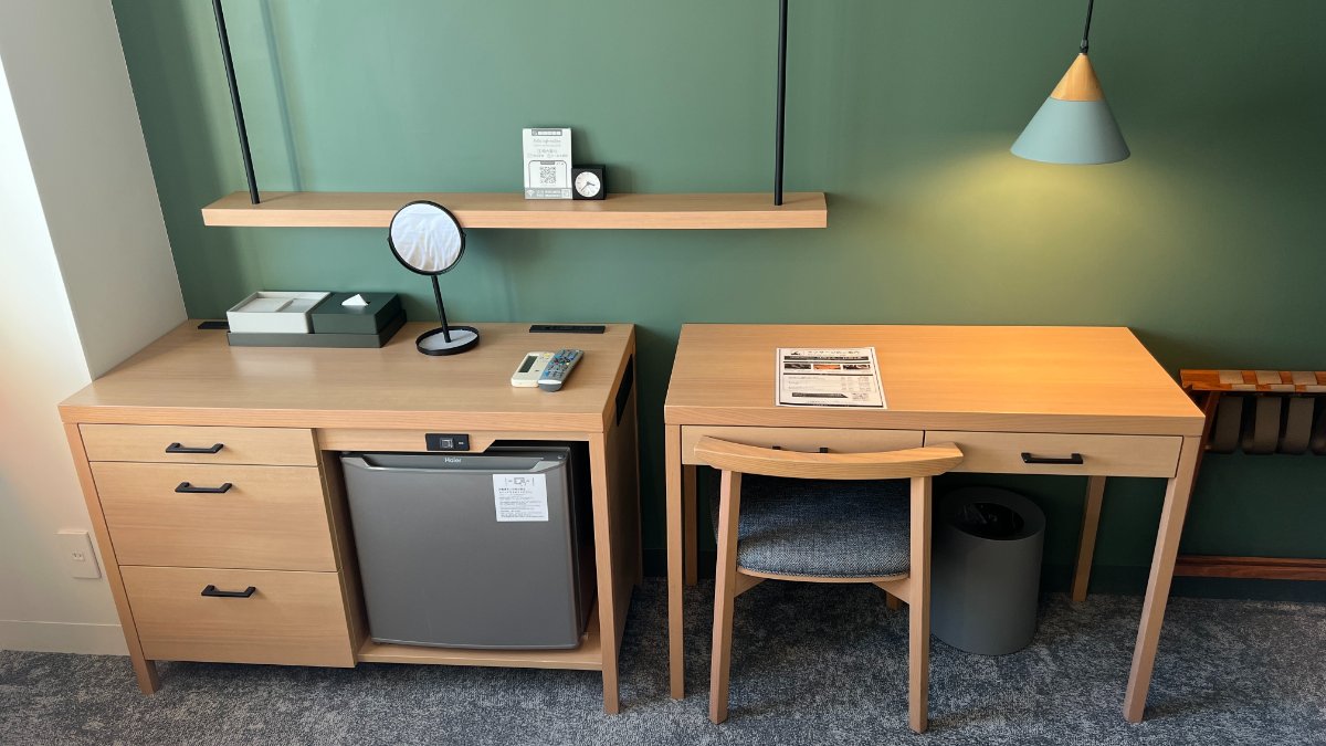 左の机はティッシュや引き出しや冷蔵庫があります。机上には荷物なんかが置けますね。
