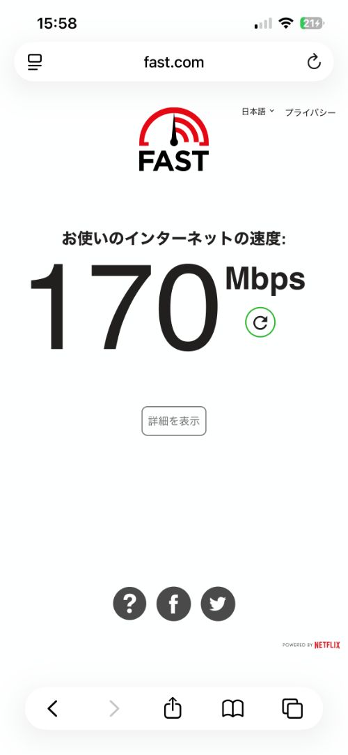 wi-fiは170Mbps前後で安定、夜間は140Mbpsまで低下しましたが、宿泊中は安定して作業やyoutube動画を視聴できました。
