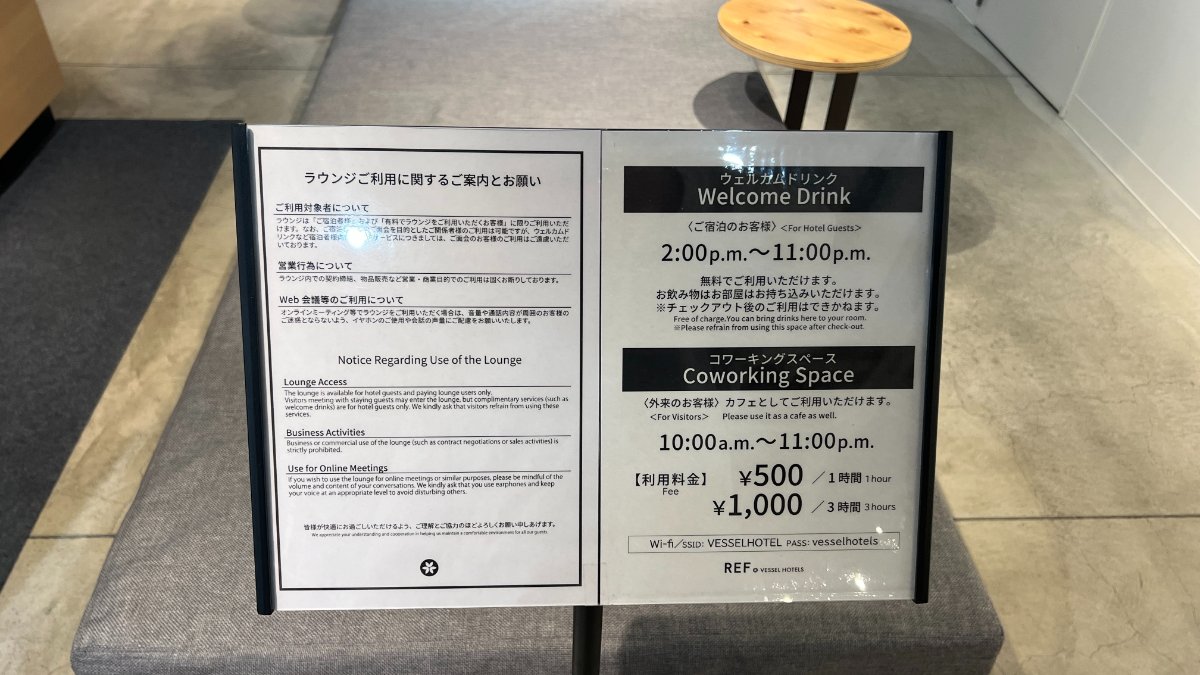 コワーキングスペースは宿泊者であればそのまま利用可能、宿泊者以外でも3時間1100円で利用できます。
